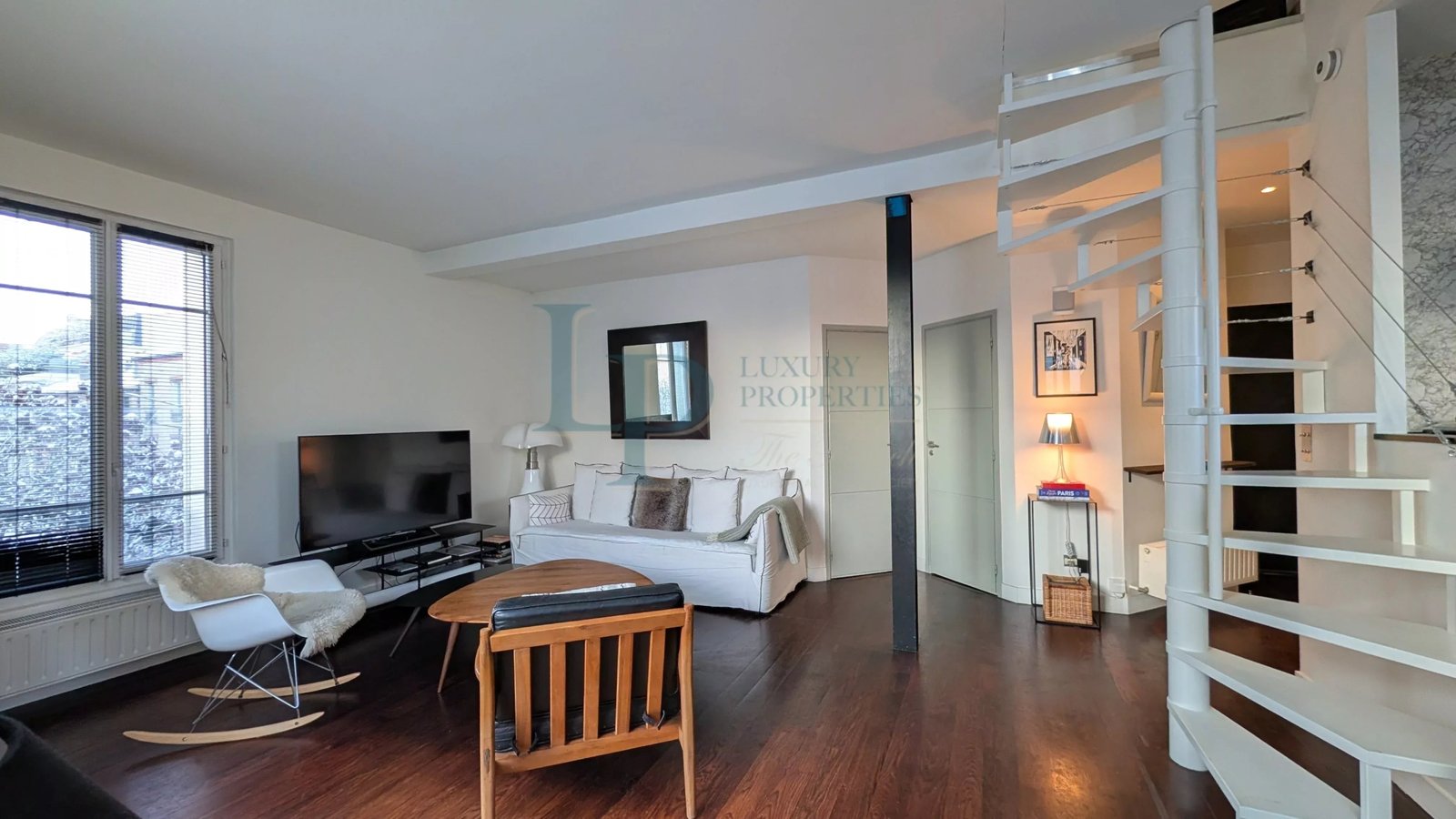 Upstairs, accessed by an elegant spiral staircase, an office area, a master bedroom and attic space converted into a child’s bedroom create an intimate, soothing night space.