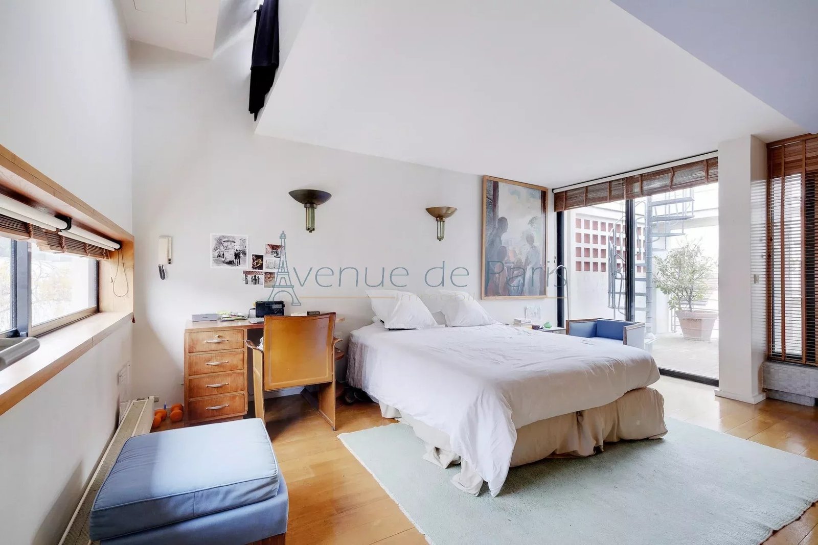 On the third floor, the master suite occupies the entire floor: bright bedroom, en-suite bathroom, small intimate terrace… and the famous spiral staircase leading to the roof terrace.